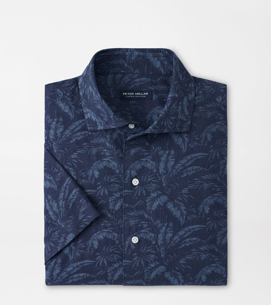This short-sleeve sport shirt is crafted from a soft, lightweight cotton. It's designed with a shorter length perfect for casual wear. Finished with a spread collar, French placket and mother-of-pearl buttons, it features a custom tropical print hand-designed in our creative studio.